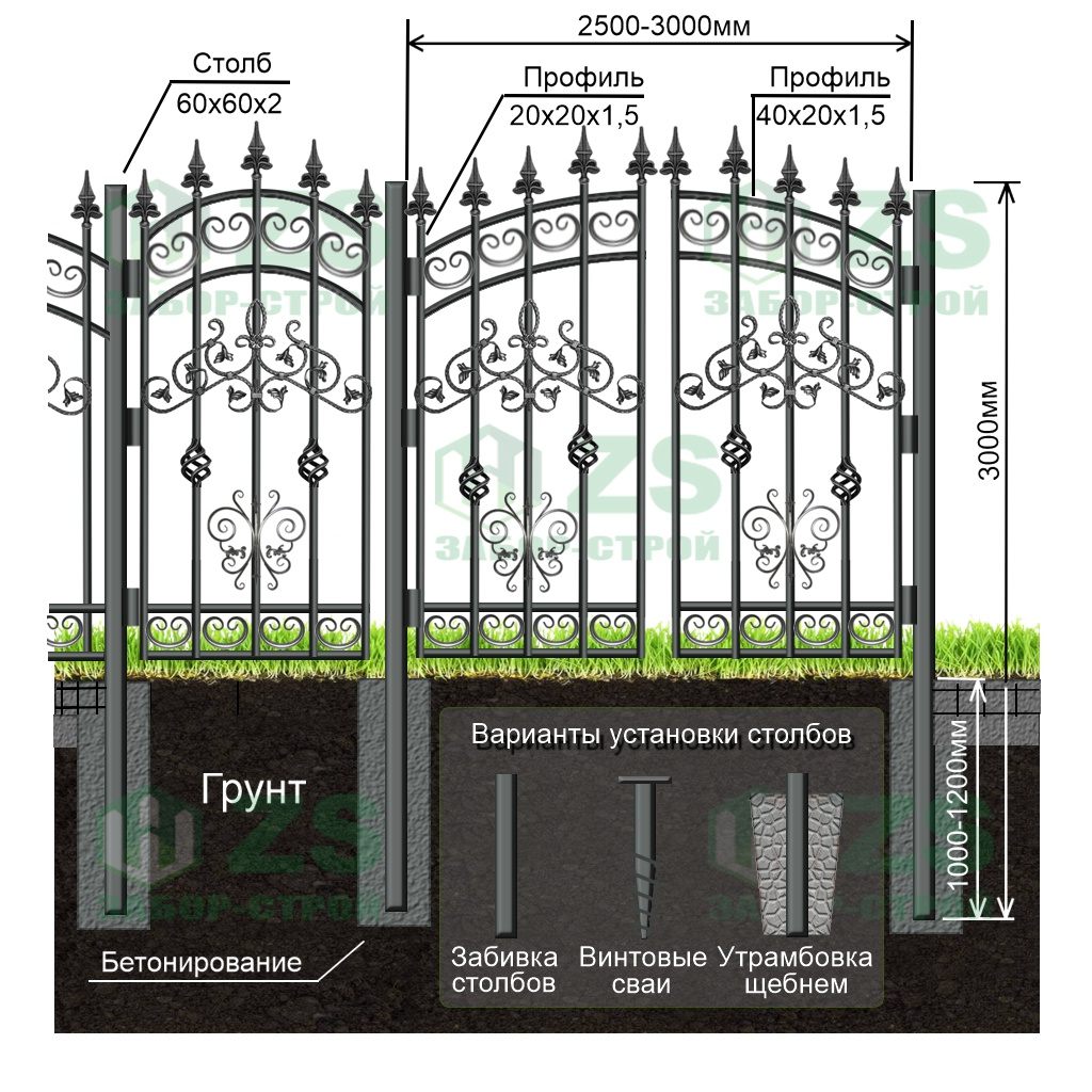 Конструкция кованого забора на ленточном фундаменте с кирпичными столбами: