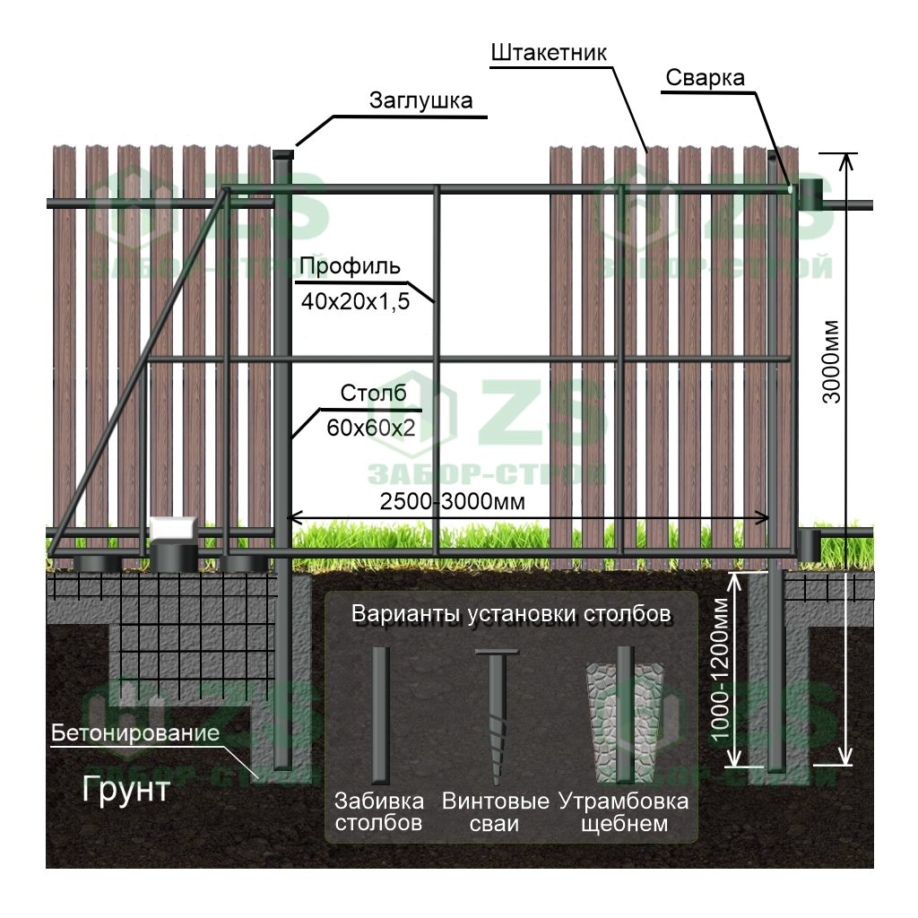 Конструкция распашных ворот с калиткой из евроштакетника:
