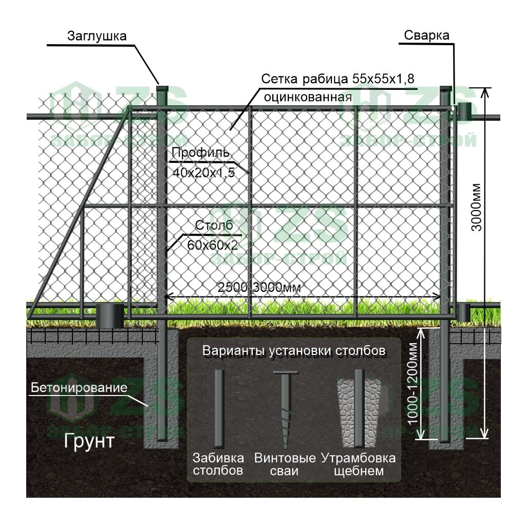 Конструкция забора из сетки рабицы в натяг: