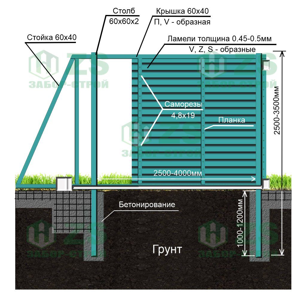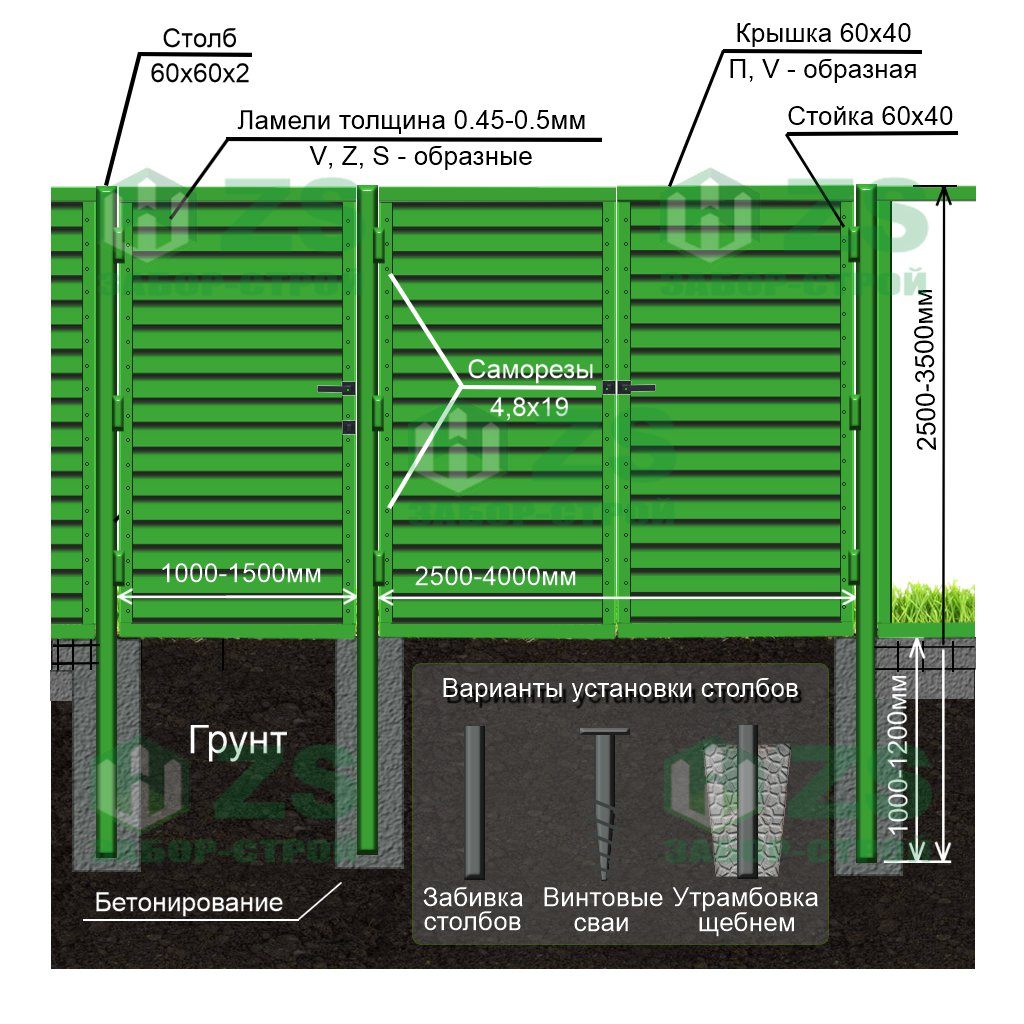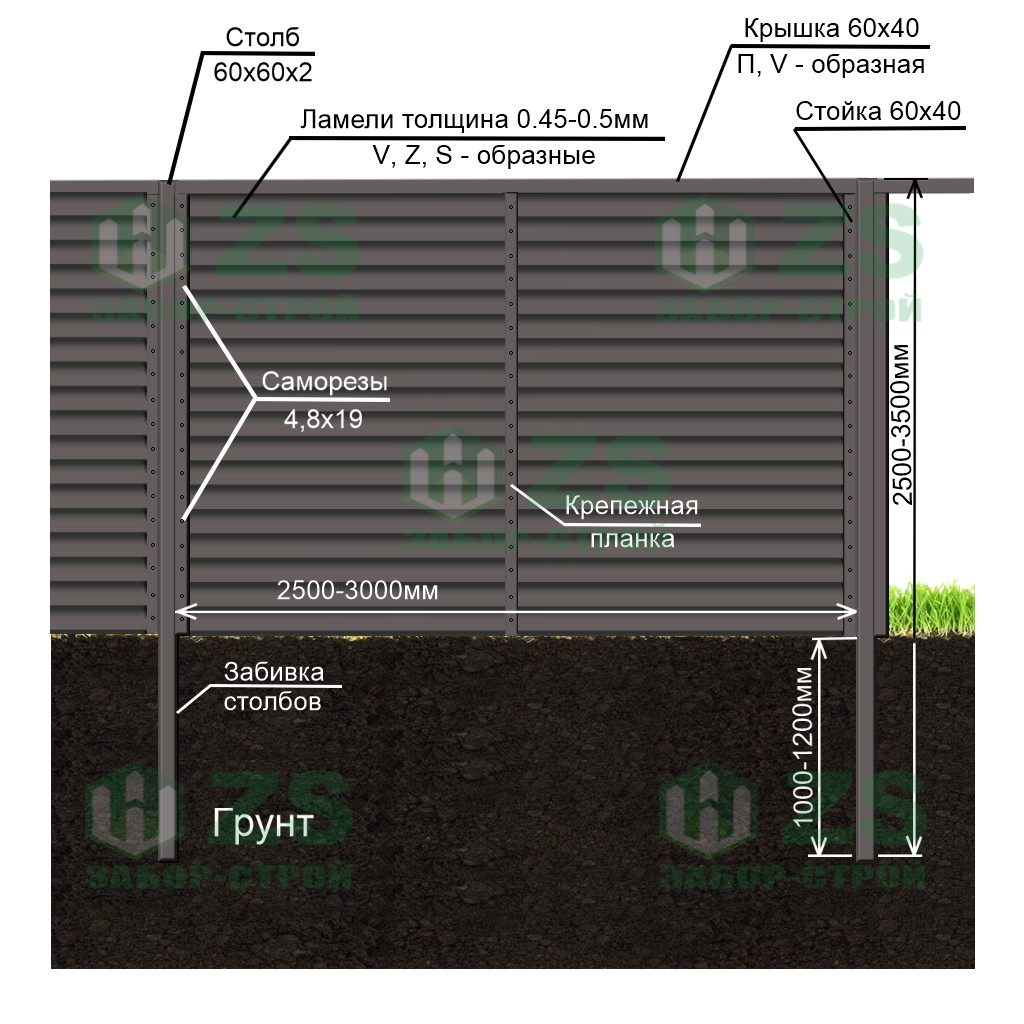 Конструкция забора жалюзи с утрамбовкой щебнем: